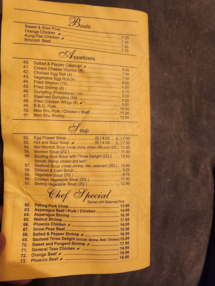 Golden Phoenix in Lakewood, CA offers a casual dining experience with a diverse menu featuring appetizers like Salted Pepper Calamari and Cream Cheese Wontons, soups including Egg Flower and Hot and Sour, and entrees like Sweet and Sour Pork and Kung Pao Chicken. The restaurant provides ample parking, reservations, and accepts credit cards, making it convenient for all diners. Customers rave about the food quality, generous portions, and attentive service, with favorites like the chow mein and honey walnut shrimp standing out. The cozy ambiance makes it ideal for both dine-in and takeout, catering to various preferences. Overall, Golden Phoenix is a hidden gem for Chinese cuisine, offering a satisfying dining experience with great prices and fantastic lunch specials.